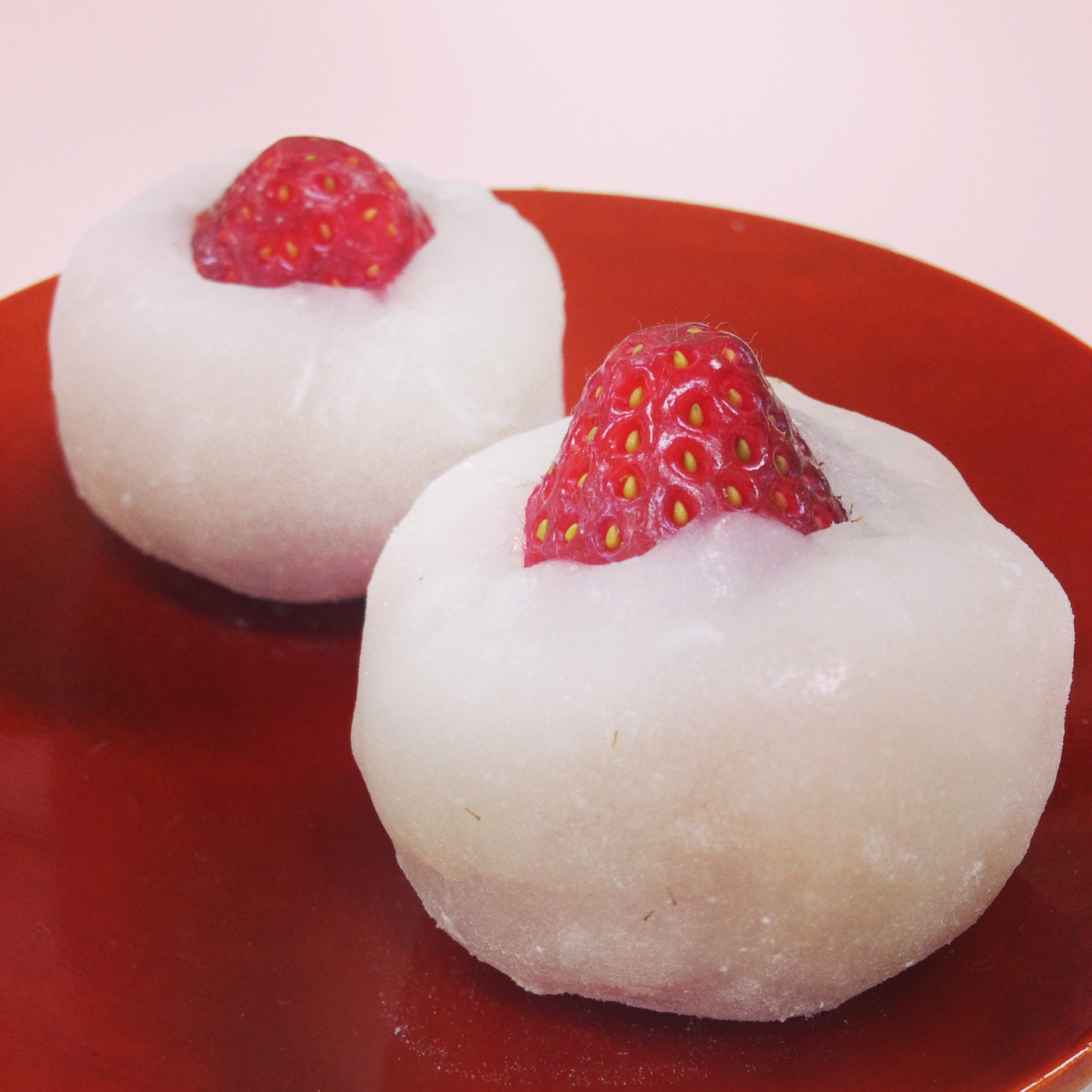 三鈴自慢のいちご大福はあまおうをピンク色の白あんで包み、さらに上から柔らかな求肥餅で包みました。